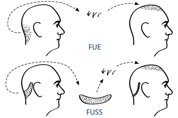 За разлика от FUSS (Folicular Unit Strip Surgery), при FUE (Follicular Unit Extraction) апаратура от последно поколение позволява да се извлече коса от донорска зона (най-често тилната част на главата), без да се отделя кожа. При FUSS обаче това е невъзможно и дори остават големи белези, скрити от космите. При FUE раната е с размер 1,8-5 мм и бързо заздравява.