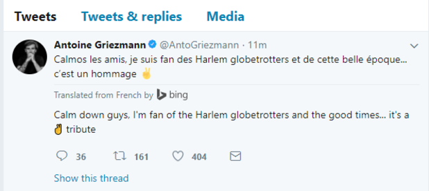 „Хора, успокойте се, аз съм фен на Харлем Глоубтротърс и на забавленията... това е признание“, обясни първоначално Гризман под снимката, но след това реши изцяло да премахне фотоса от профила си.