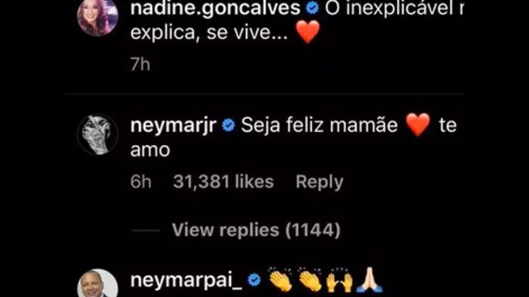 "Неописуемото не се обяснява, а се изживява", е написала Надин относно снимката, а отдолу в коментарите тя е поздравена от сина си с думите "Бъди щастлива, мамо, обичам те". Неймар-старши също е коментирал окуражително.